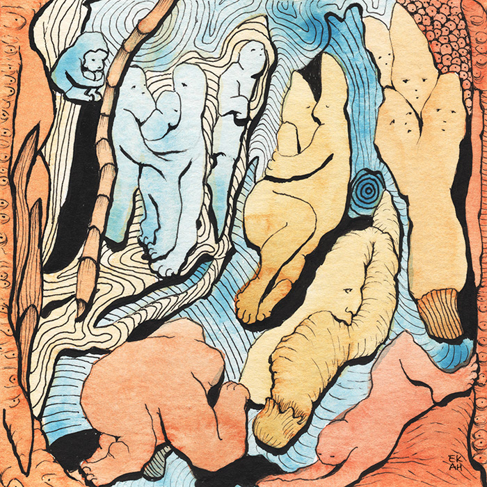 Most of the images were developed by using random blobs of colors on watercolor paper as a starting point. The hidden shapes were then defined and established during the inking process, similar to finding hidden shapes in the clouds, or pareidolia.