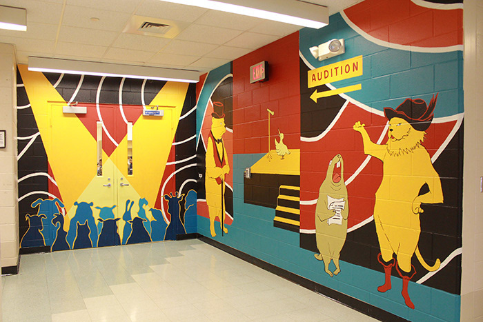 Murals at Stratton Academy of the Arts is a collaboration between myself and Mandy Danowitz, along with talented, young students ranging from 2nd through 5th grade from Mr. Casey Kashnig's Art Studio class at Stratton Elementary School. The mural design is based on my “Audition” illustration that I have modified to accommodate younger students to work with. New character designs have also been added to better represent the school's artistic and creative environment. Mandy and I spent three months, three times a week, with the students - teaching and guiding them through the mural painting process. The mural covers multiple walls that span 83 feet (23 meters) in total width. Stratton is an arts magnet school which specializes in visual and